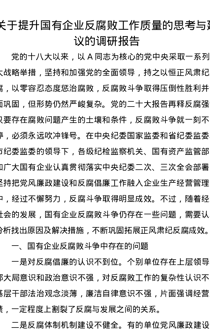 关于提升国有企业反腐败工作质量的思考与建议的调研报告