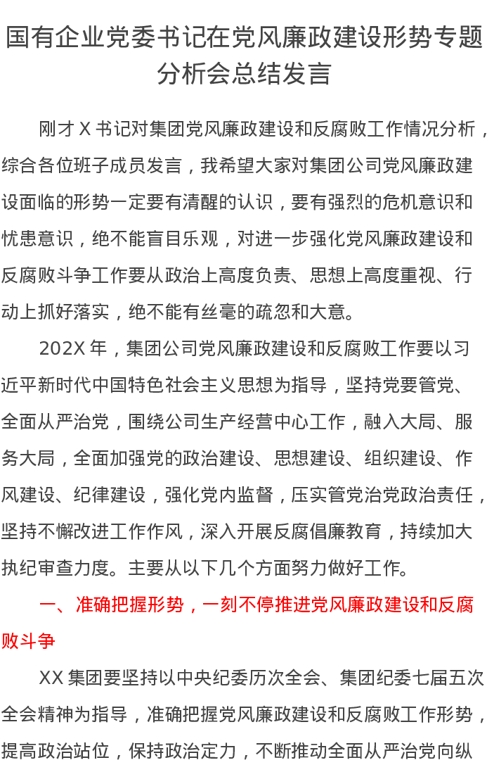 国有企业党委书记在党风廉政建设形势专题分析会总结发言