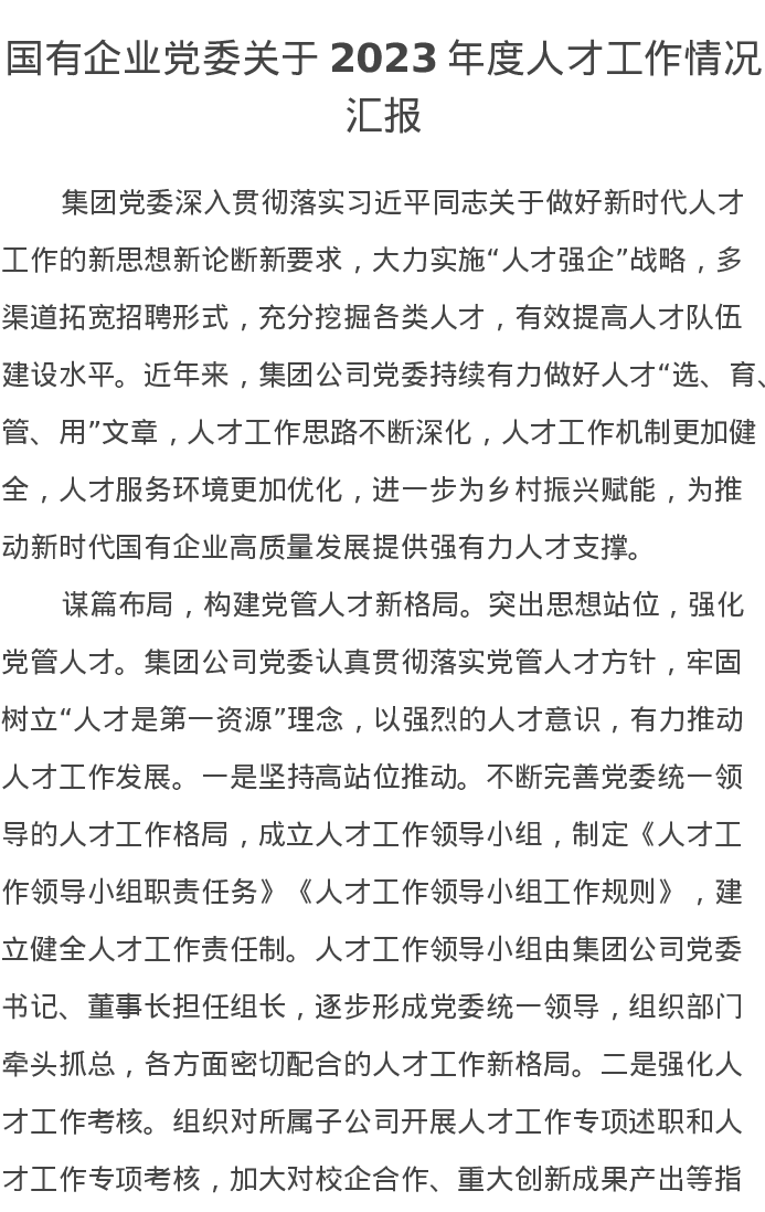 国有企业党委关于2023年度人才工作情况汇报