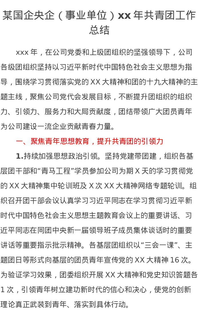 某国企央企(事业单位)xx年共青团工作总结