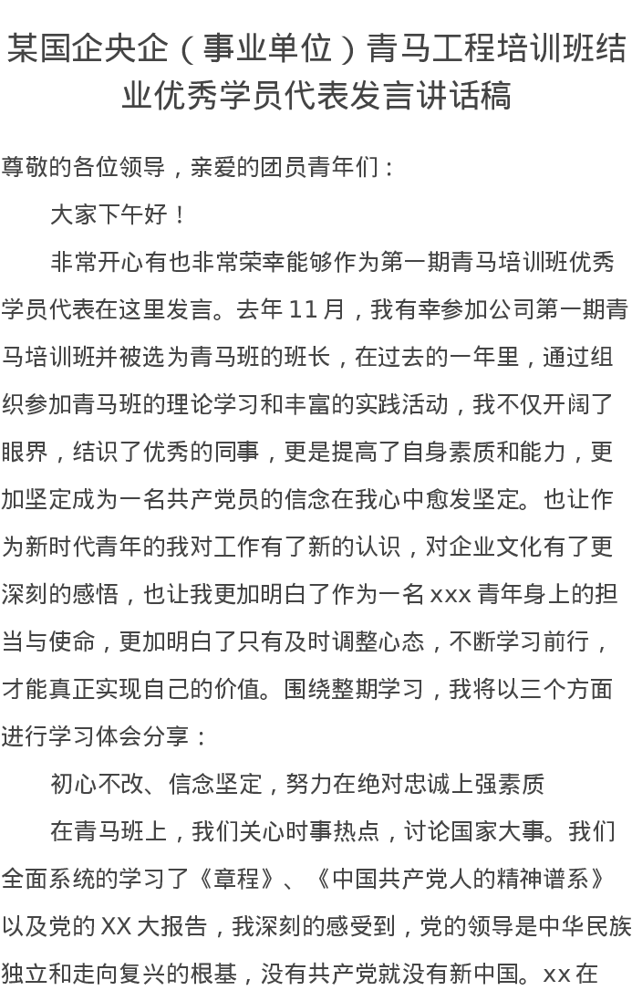 某国企央企(事业单位)青马工程培训班结业优秀学员代表发言讲话稿