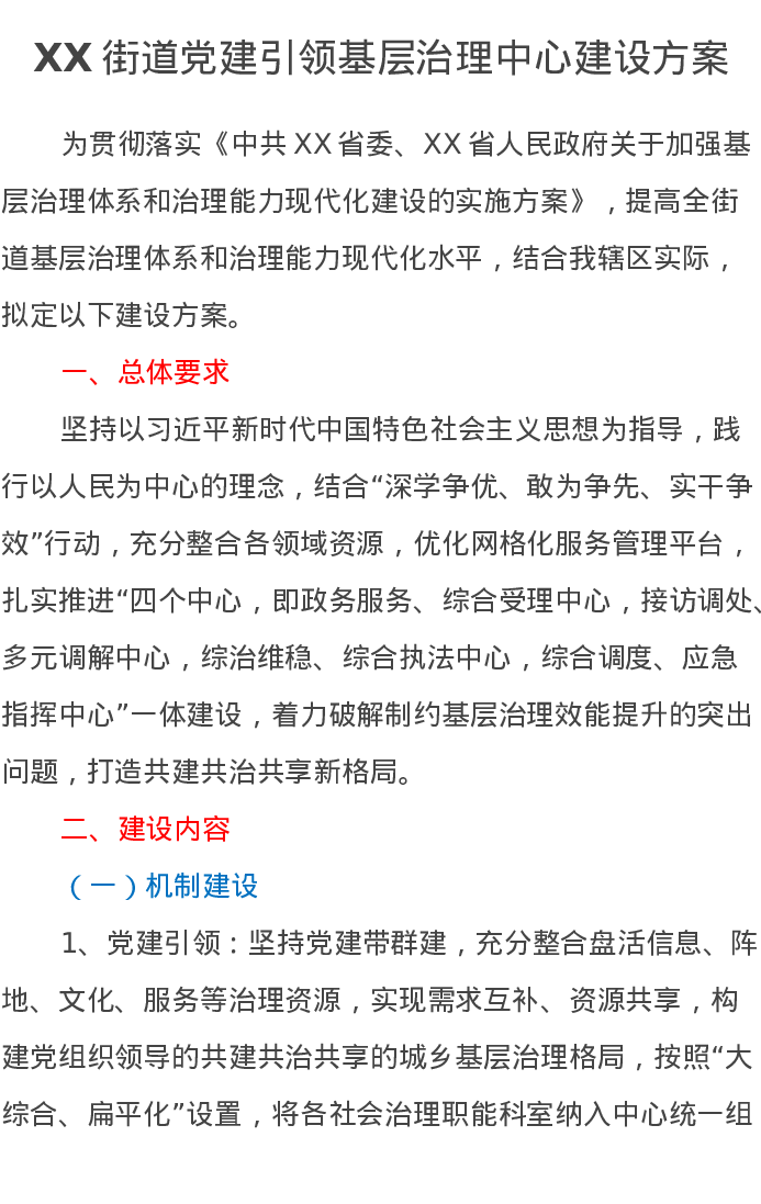 XX街道党建引领基层治理中心建设方案