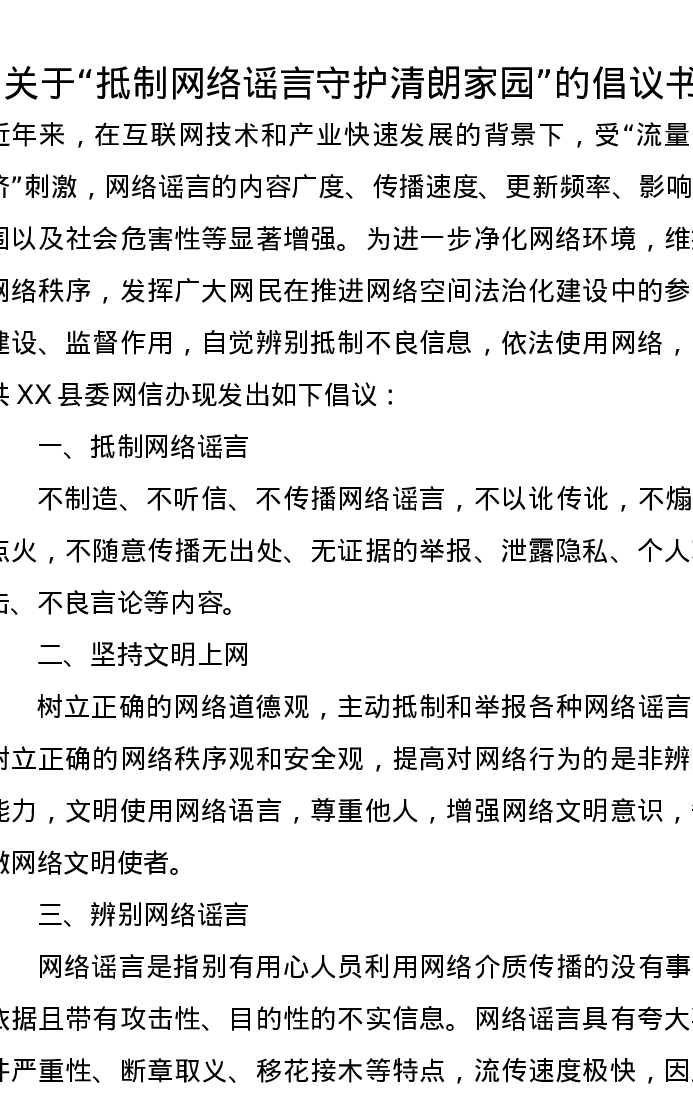 关于“抵制网络谣言守护清朗家园”的倡议书