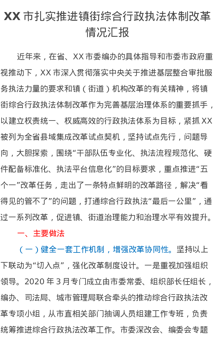 XX市扎实推进镇街综合行政执法体制改革情况汇报