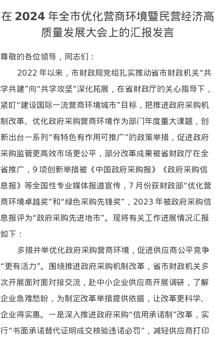 在2024年全市优化营商环境暨民营经济高质量发展大会上的汇报发言
