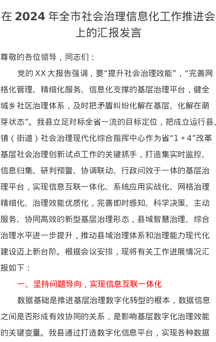 在2024年全市社会治理信息化工作推进会上的汇报发言