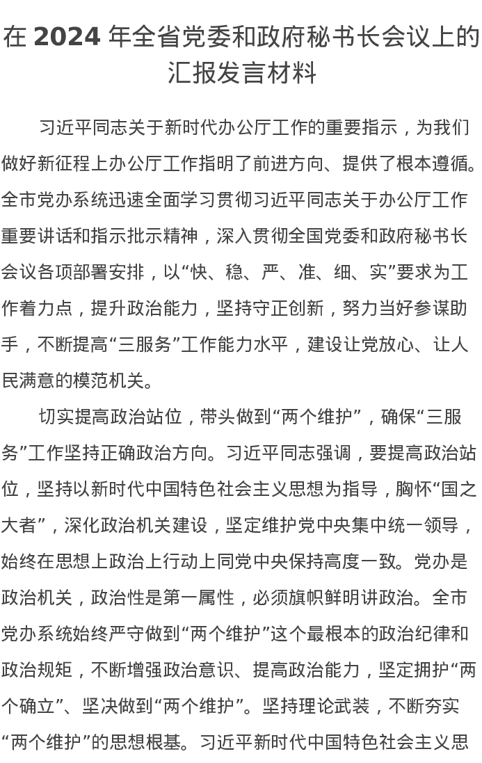 在2024年全省党委和政府秘书长会议上的汇报发言材料
