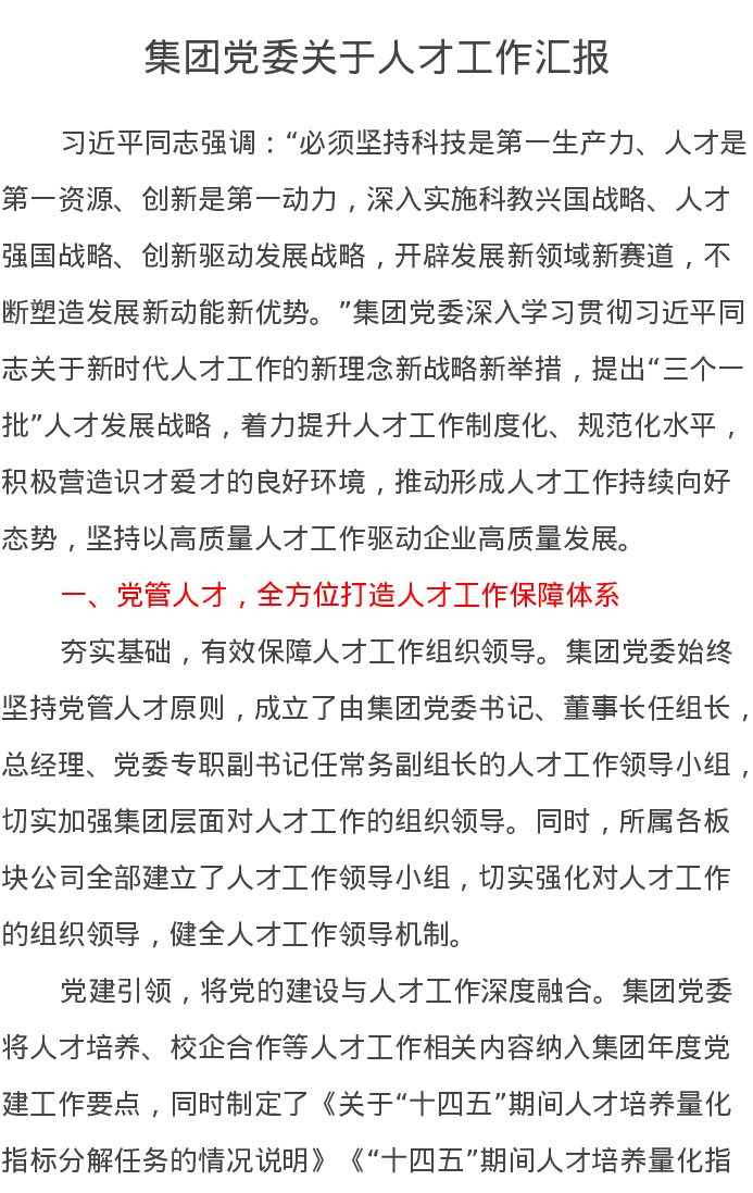 集团党委关于人才工作汇报