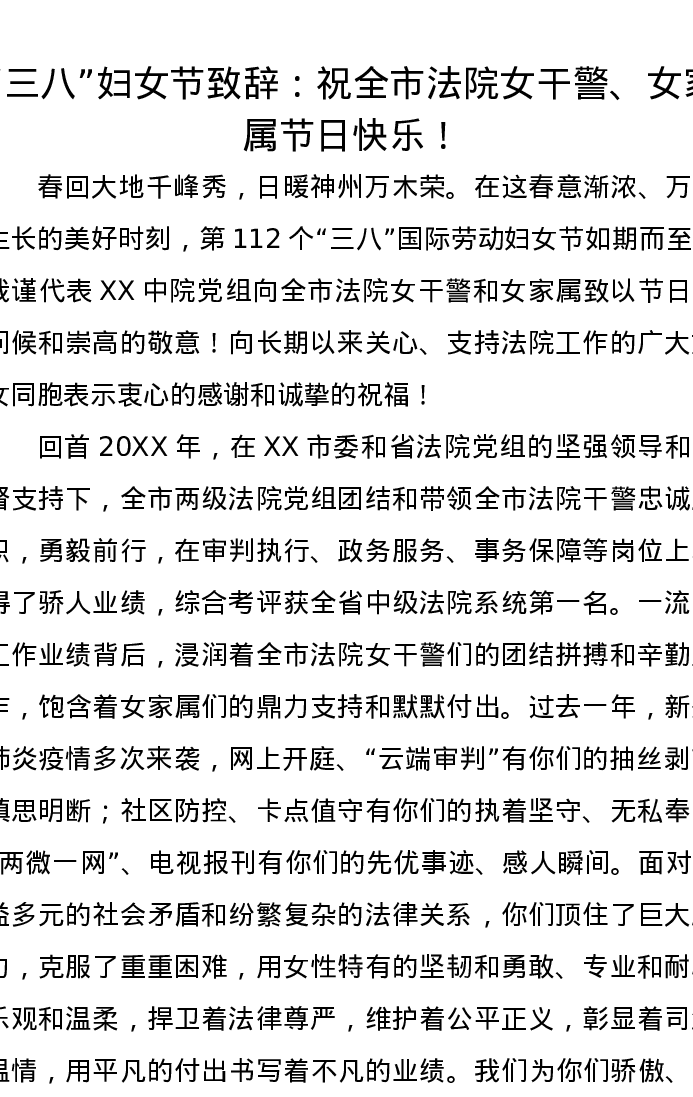 “三八”妇女节致辞:祝全市法院女干警、女家属节日快乐!