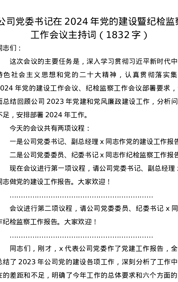 公司党委书记在2024年党的建设暨纪检监察工作会议主持词