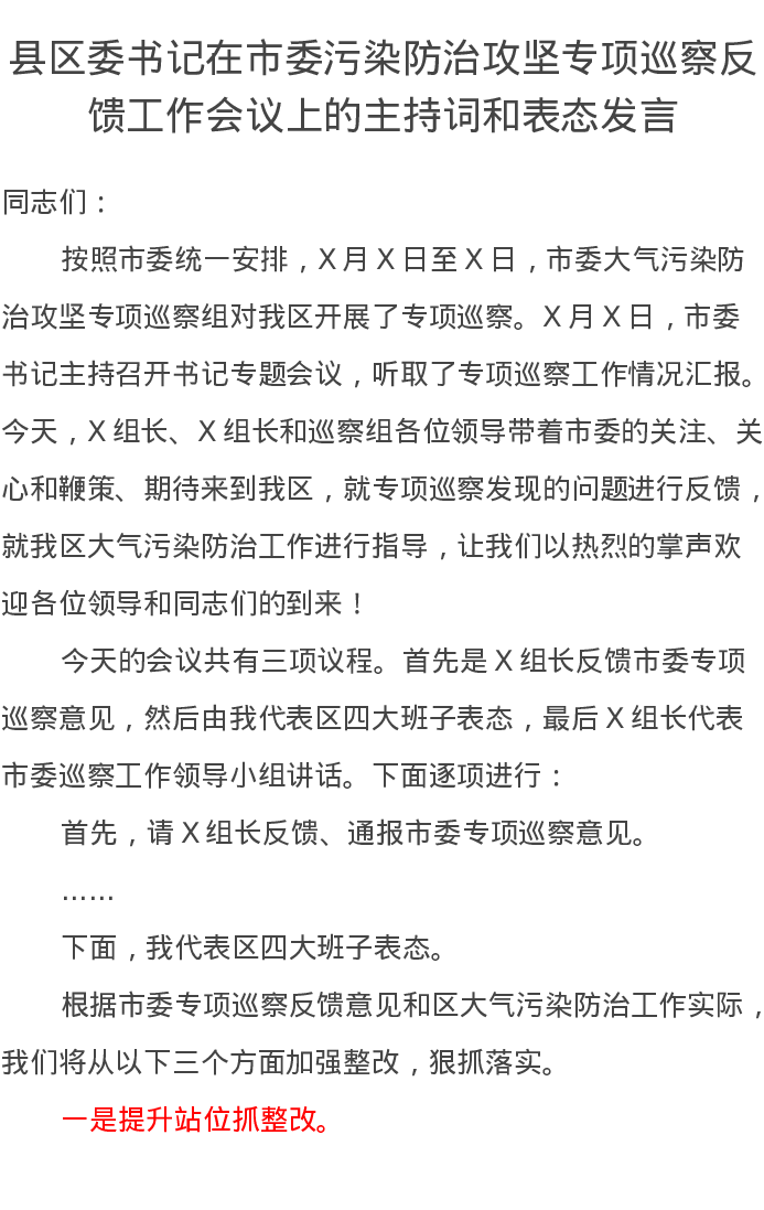 县区委书记在市委污染防治攻坚专项巡察反馈工作会议上的主持词和表态发言