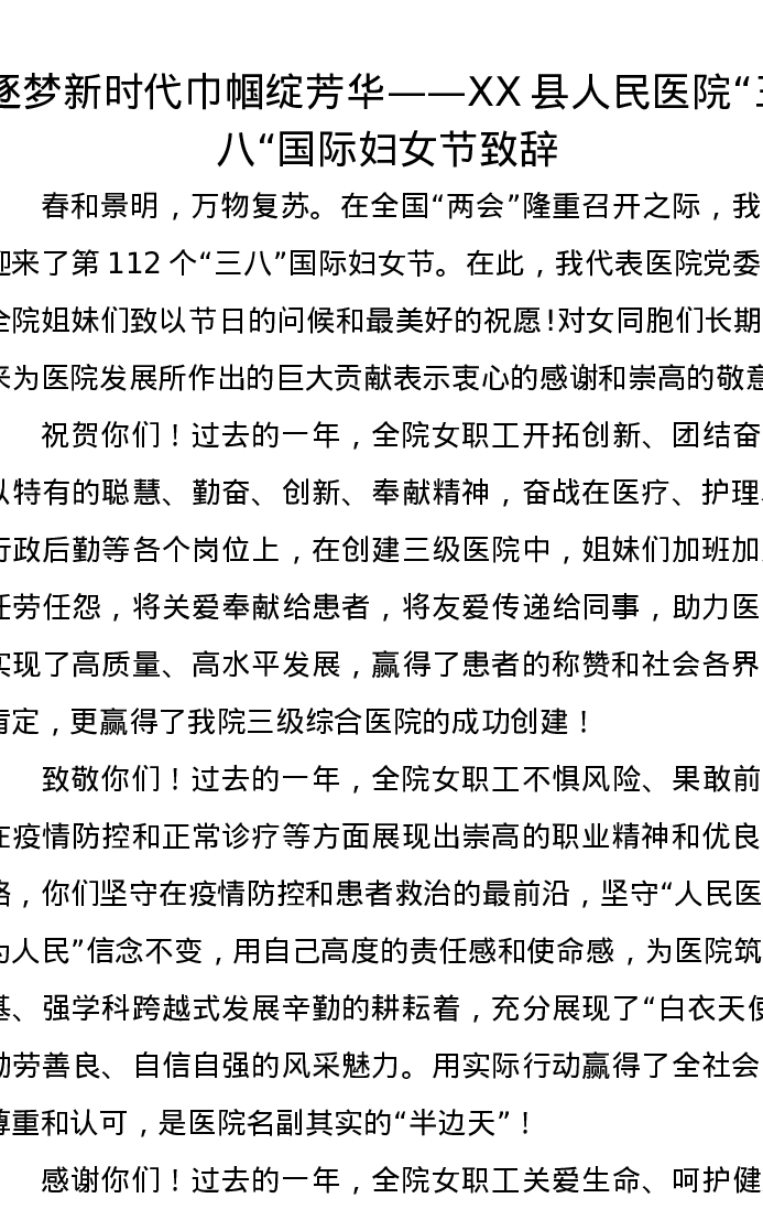 逐梦新时代巾帼绽芳华——XX县人民医院“三八“国际妇女节致辞