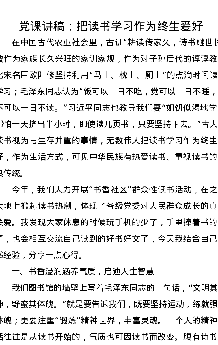 党课讲稿:把读书学习作为终生爱好