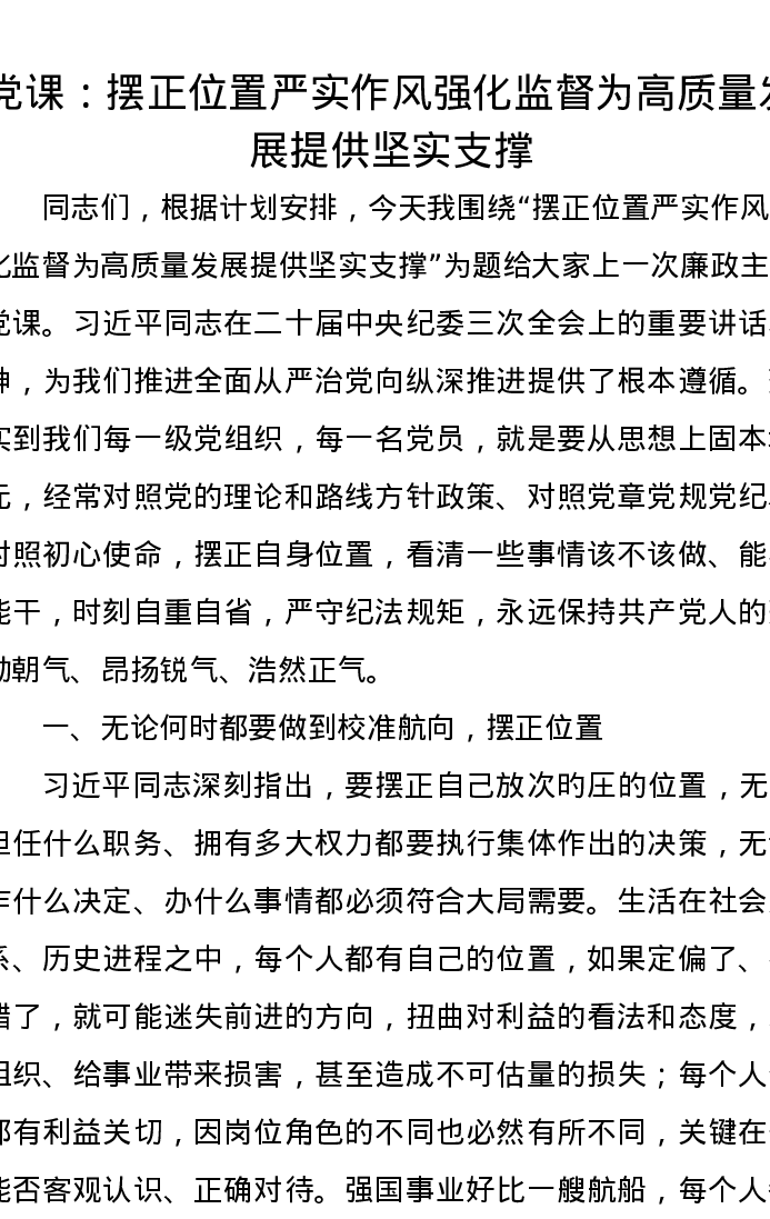 党课讲稿:摆正位置 严实作风 强化监督 为高质量发展提供坚实支撑