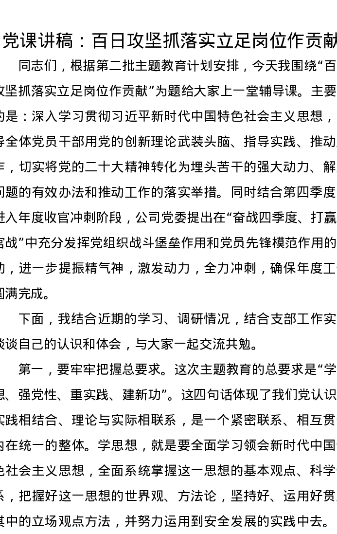 党课讲稿:百日攻坚抓落实立足岗位作贡献