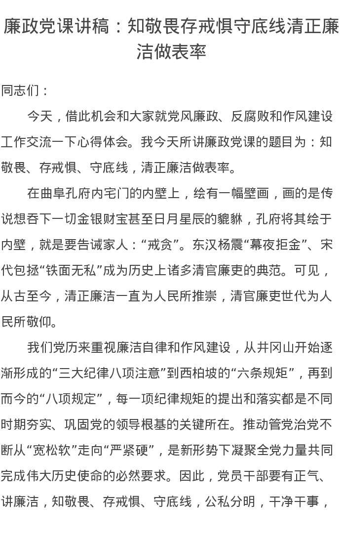 廉政党课讲稿:知敬畏存戒惧守底线清正廉洁做表率