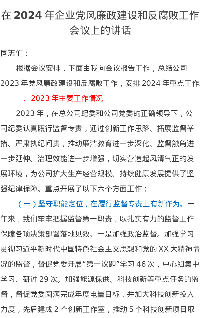 在2024年企业党风廉政建设和反腐败工作会议上的讲话