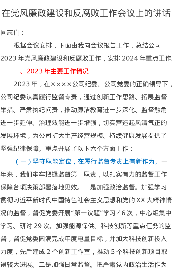 在X国企(公司)党风廉政建设和反腐败工作会议上的讲话