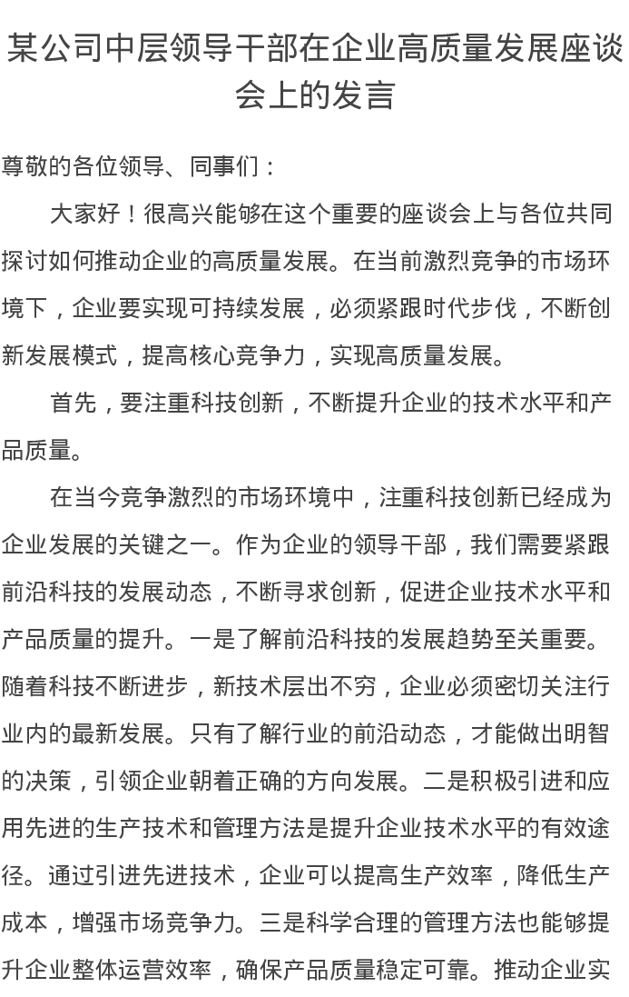 某公司中层领导干部在企业高质量发展座谈会上的发言