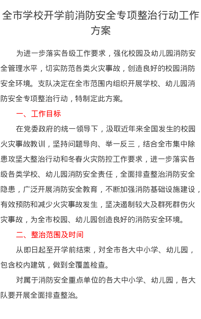 全市学校开学前消防安全专项整治行动工作方案