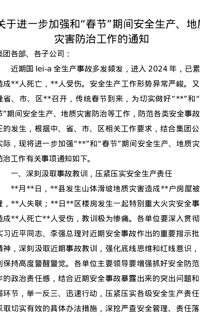关于进一步加强和“春节”期间安全生产、地质灾害防治工作的通知