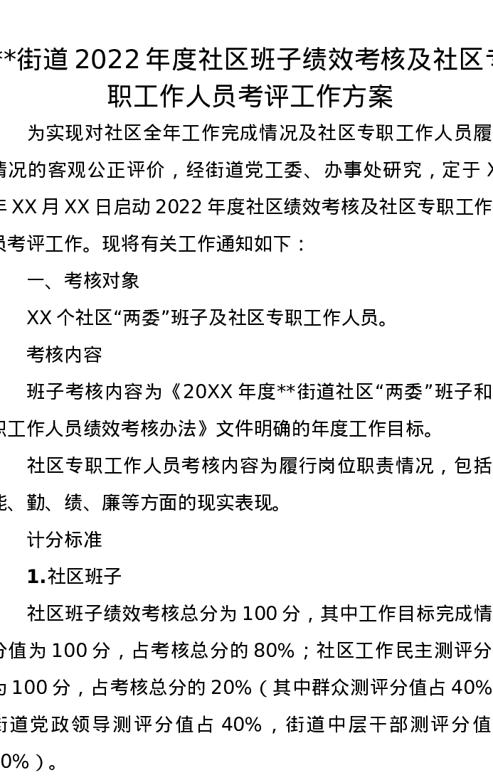 街道2022年度社区班子绩效考核及社区专职工作人员考评工作方案