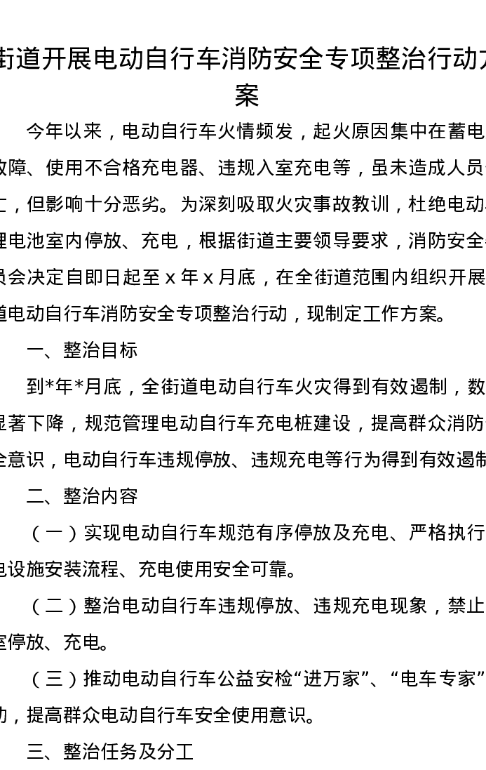 街道开展电动自行车消防安全专项整治行动方案