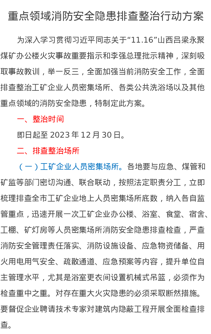 重点领域消防安全隐患排查整治行动方案