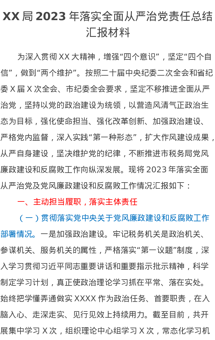 XX局2023年落实全面从严治党责任总结汇报材料