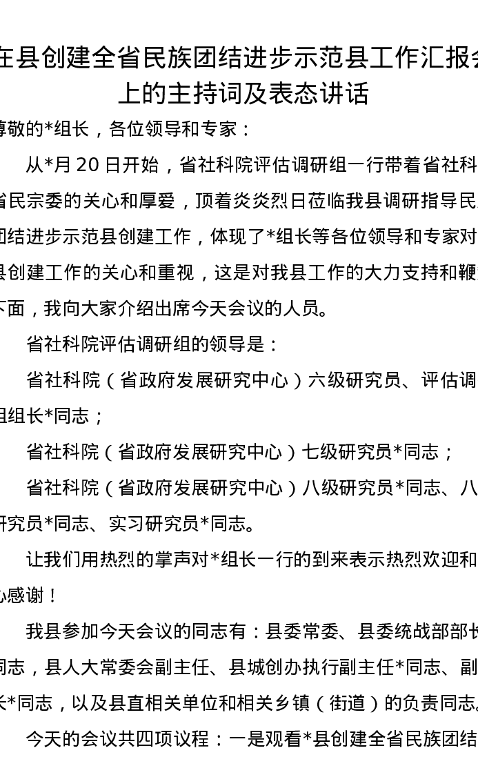 在县创建全省民族团结进步示范县工作汇报会上的主持词及表态讲话