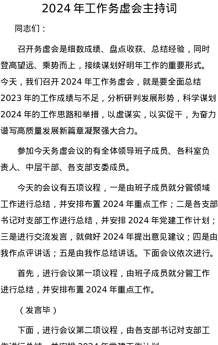 2024年工作务虚会主持词