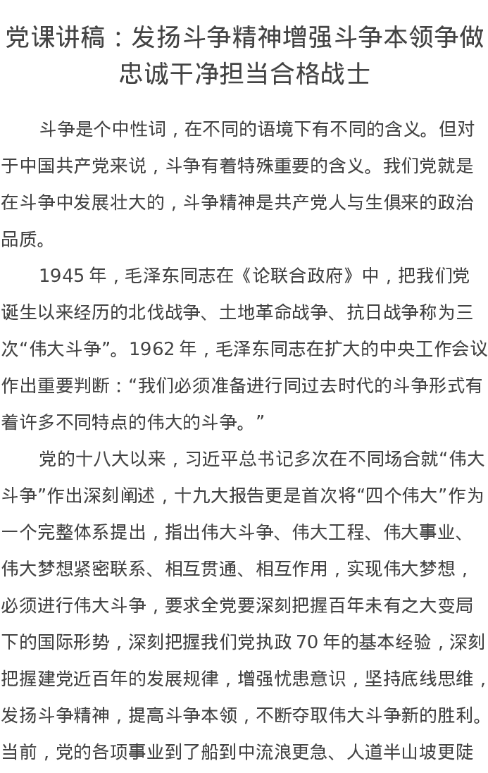 党课讲稿:发扬斗争精神增强斗争本领争做忠诚干净担当合格战士