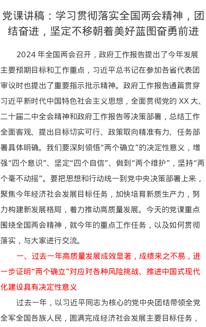 党课讲稿:学习贯彻落实全国两会精神,团结奋进,坚定不移朝着美好蓝图奋勇前进