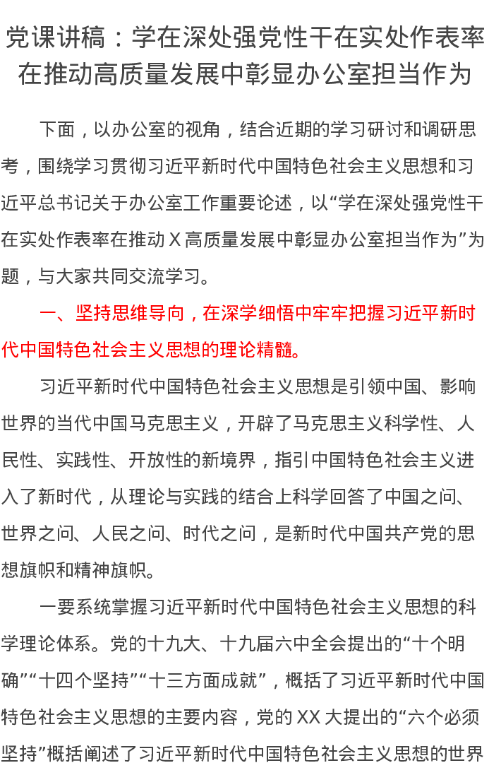 党课讲稿:学在深处强党性干在实处作表率在推动高质量发展中彰显办公室担当作为