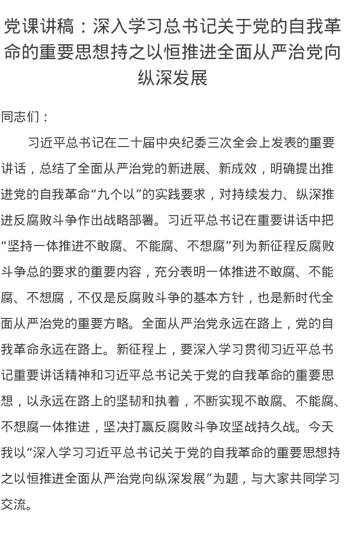 党课讲稿:深入学习总书记关于党的自我革命的重要思想持之以恒推进全面从严治党向纵深发展