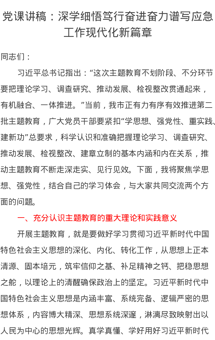 党课讲稿:深学细悟笃行奋进奋力谱写应急工作现代化新篇章