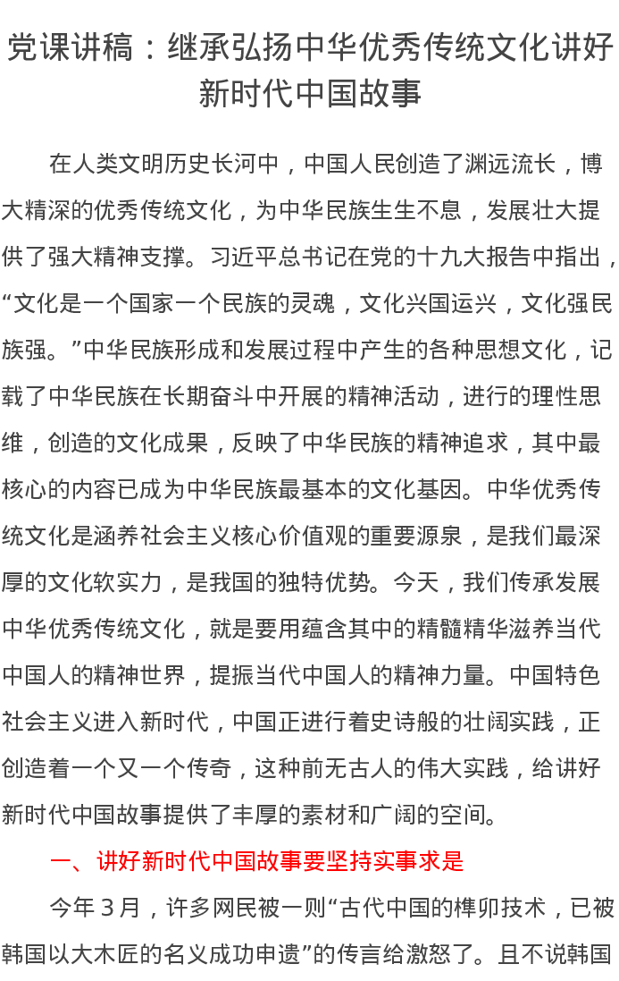 党课讲稿:继承弘扬中华优秀传统文化讲好新时代中国故事