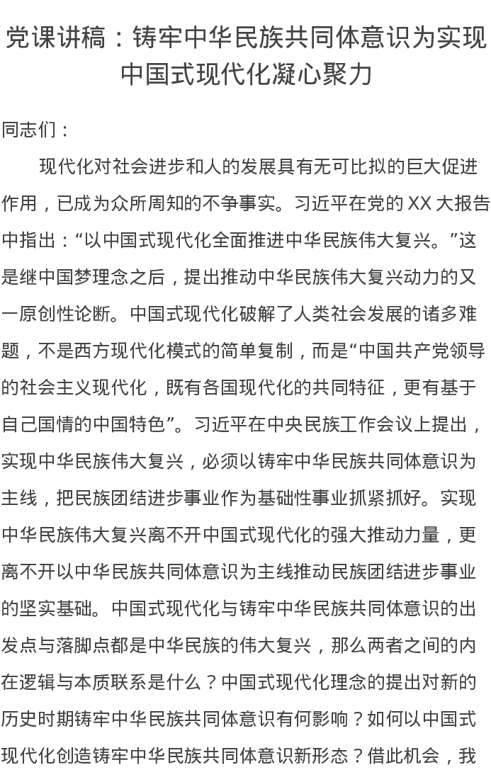 党课讲稿:铸牢中华民族共同体意识为实现中国式现代化凝心聚力