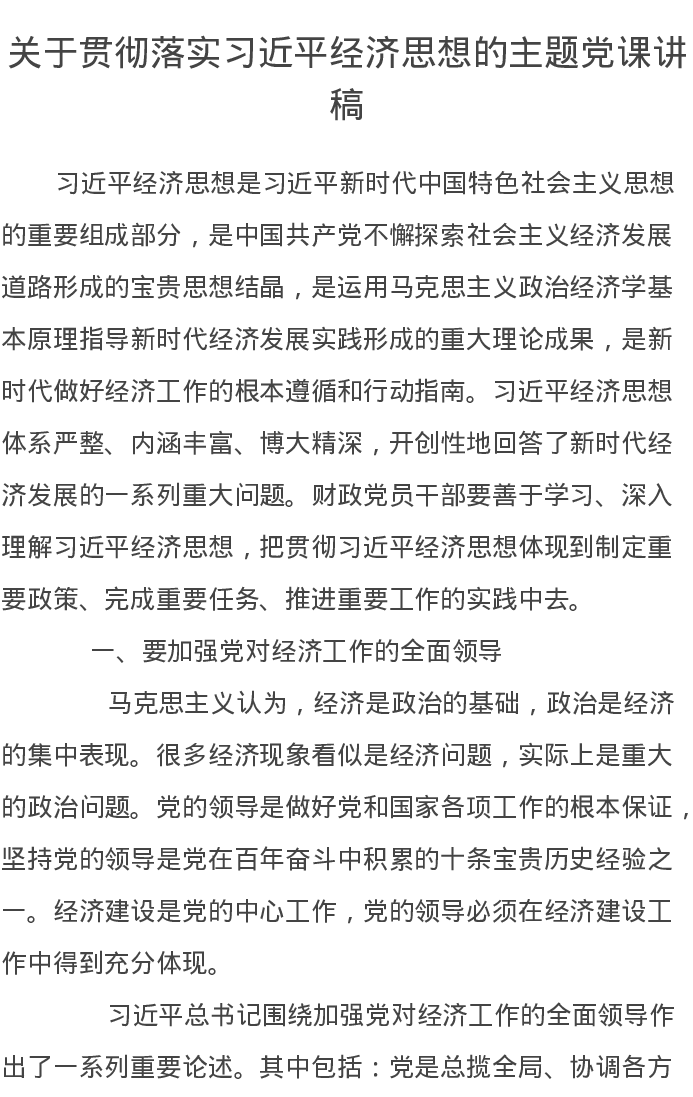 关于贯彻落实习近平经济思想的主题党课讲稿