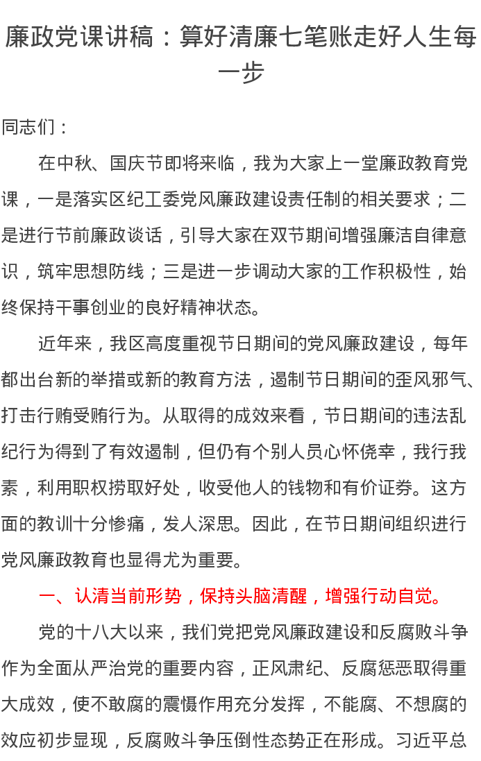 廉政党课讲稿:算好清廉七笔账走好人生每一步