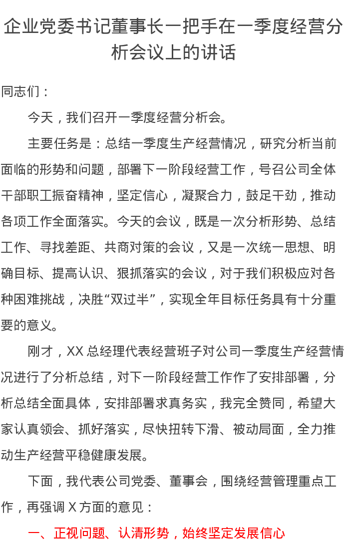 企业党委书记董事长一把手在一季度经营分析会议上的讲话