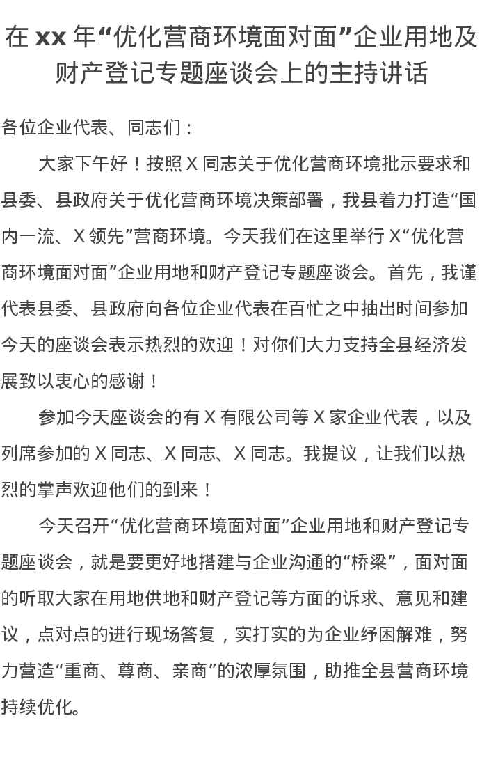 在xx年“优化营商环境面对面”企业用地及财产登记专题座谈会上的主持讲话