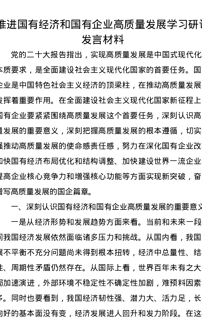 推进国有经济和国有企业高质量发展学习研讨发言材料