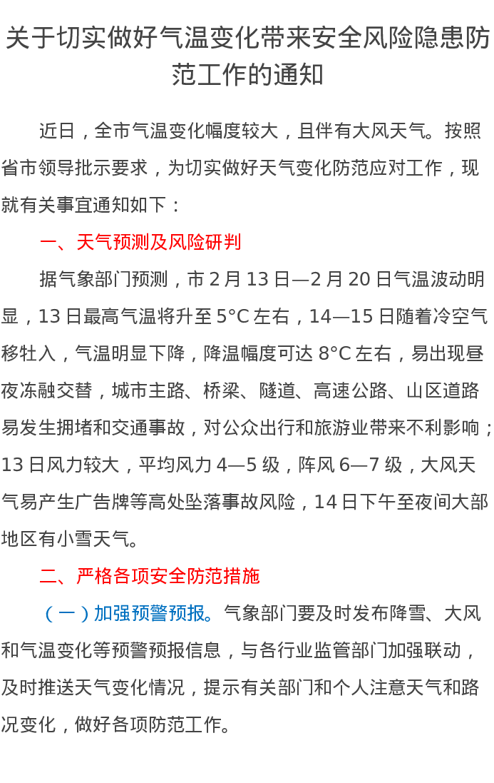 关于切实做好气温变化带来安全风险隐患防范工作的通知