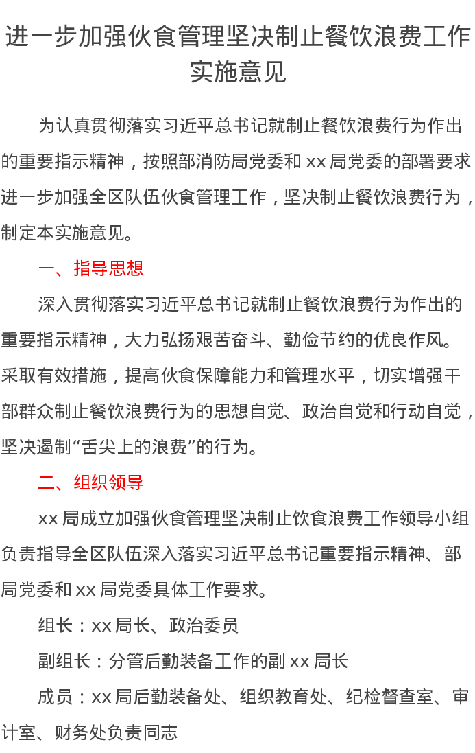 进一步加强伙食管理坚决制止餐饮浪费工作实施意见