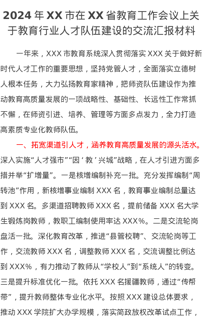 2024年XX市在XX省教育工作会议上关于教育行业人才队伍建设的交流汇报材料