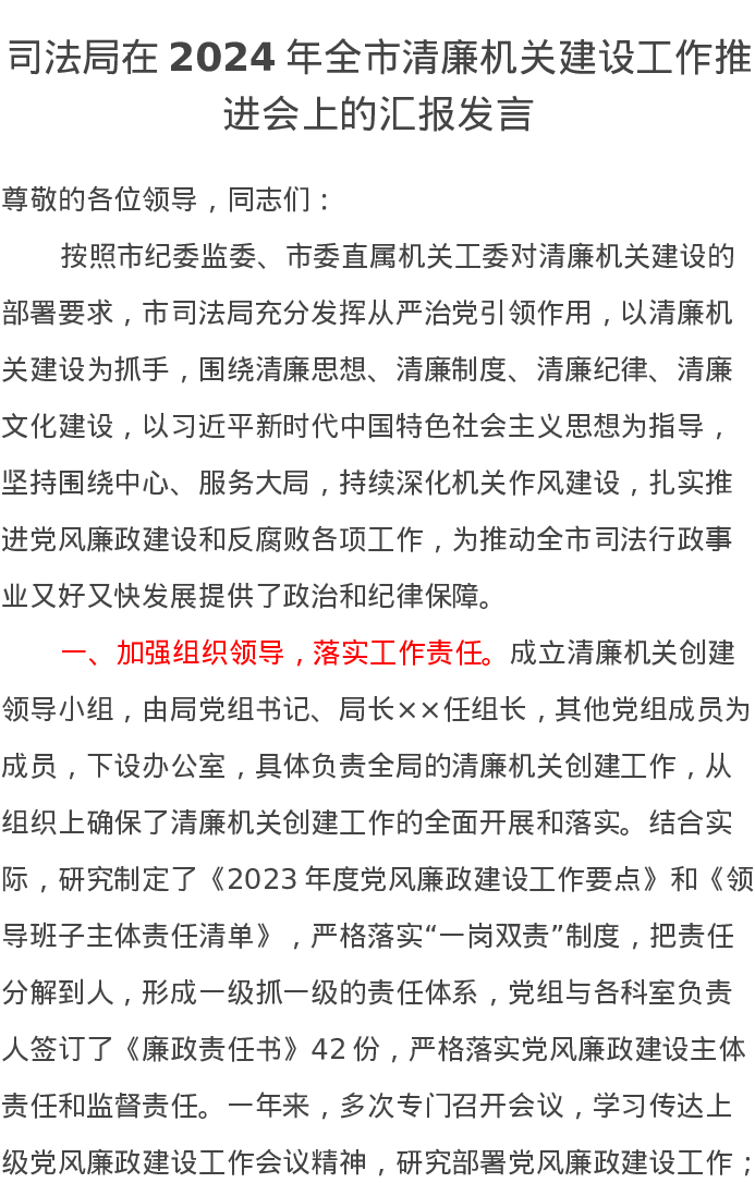司法局在2024年全市清廉机关建设工作推进会上的汇报发言