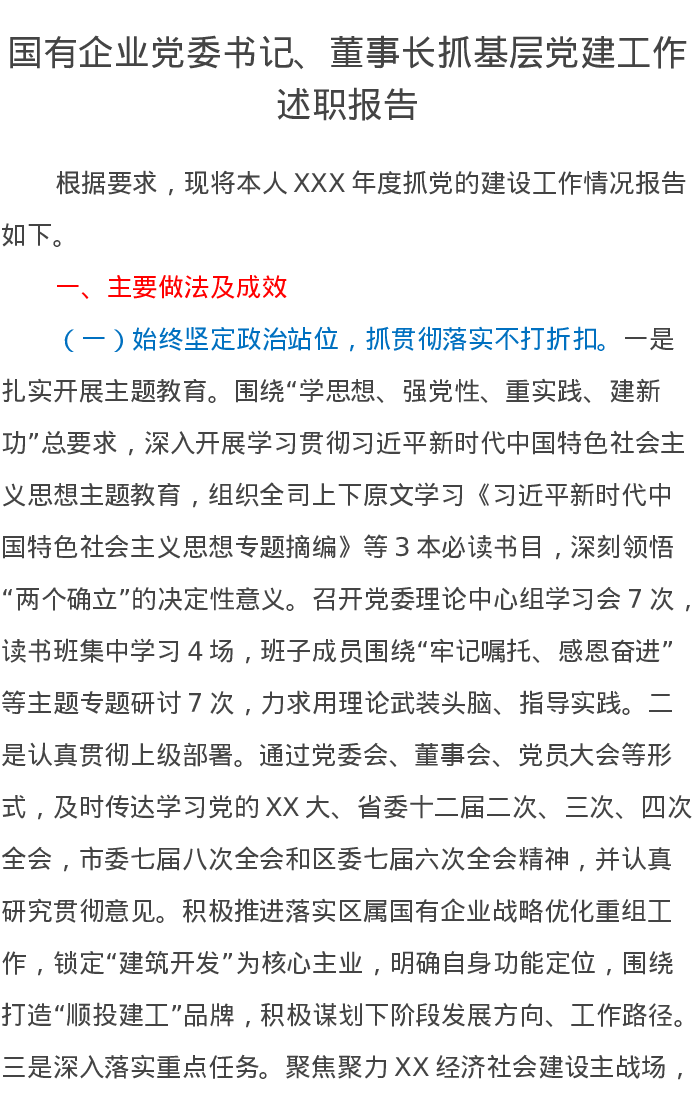 国有企业党委书记、董事长抓基层党建工作述职报告