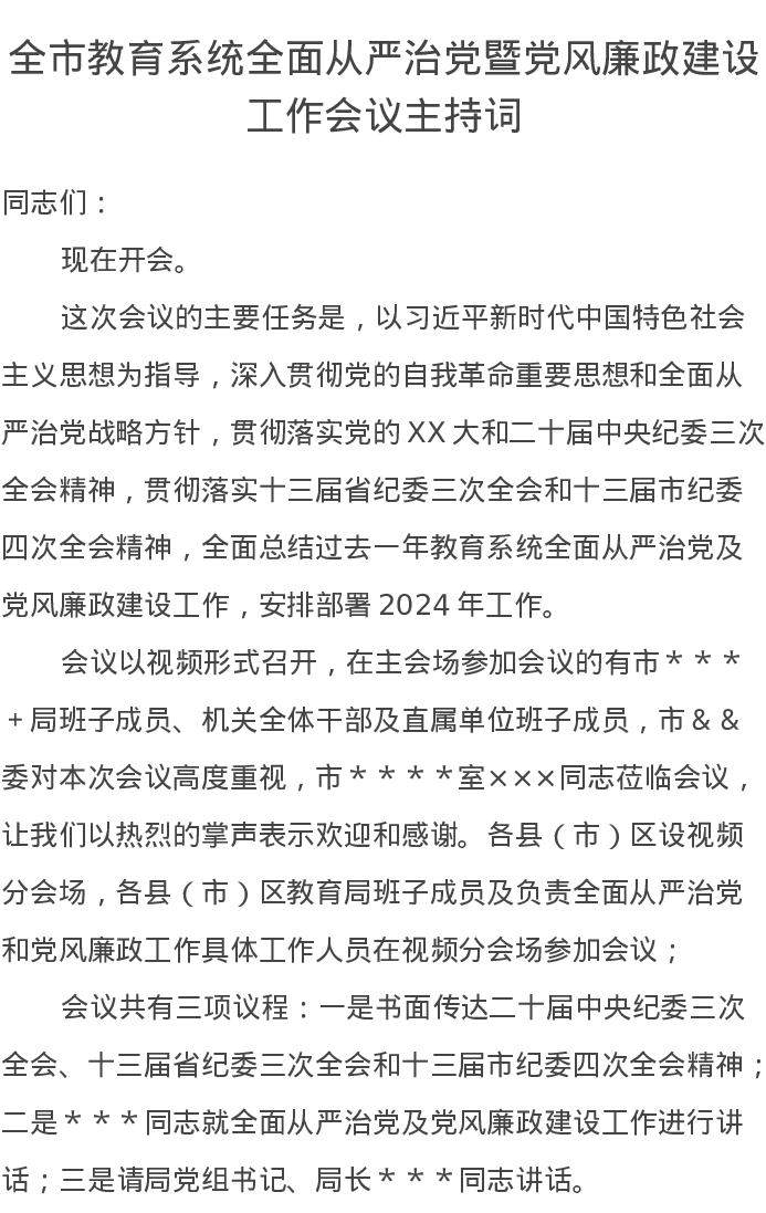 全市教育系统全面从严治党暨党风廉政建设工作会议主持词