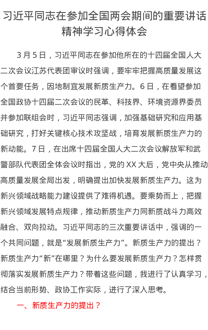 习近平总书记在参加全国两会期间的重要讲话精神学习心得体会